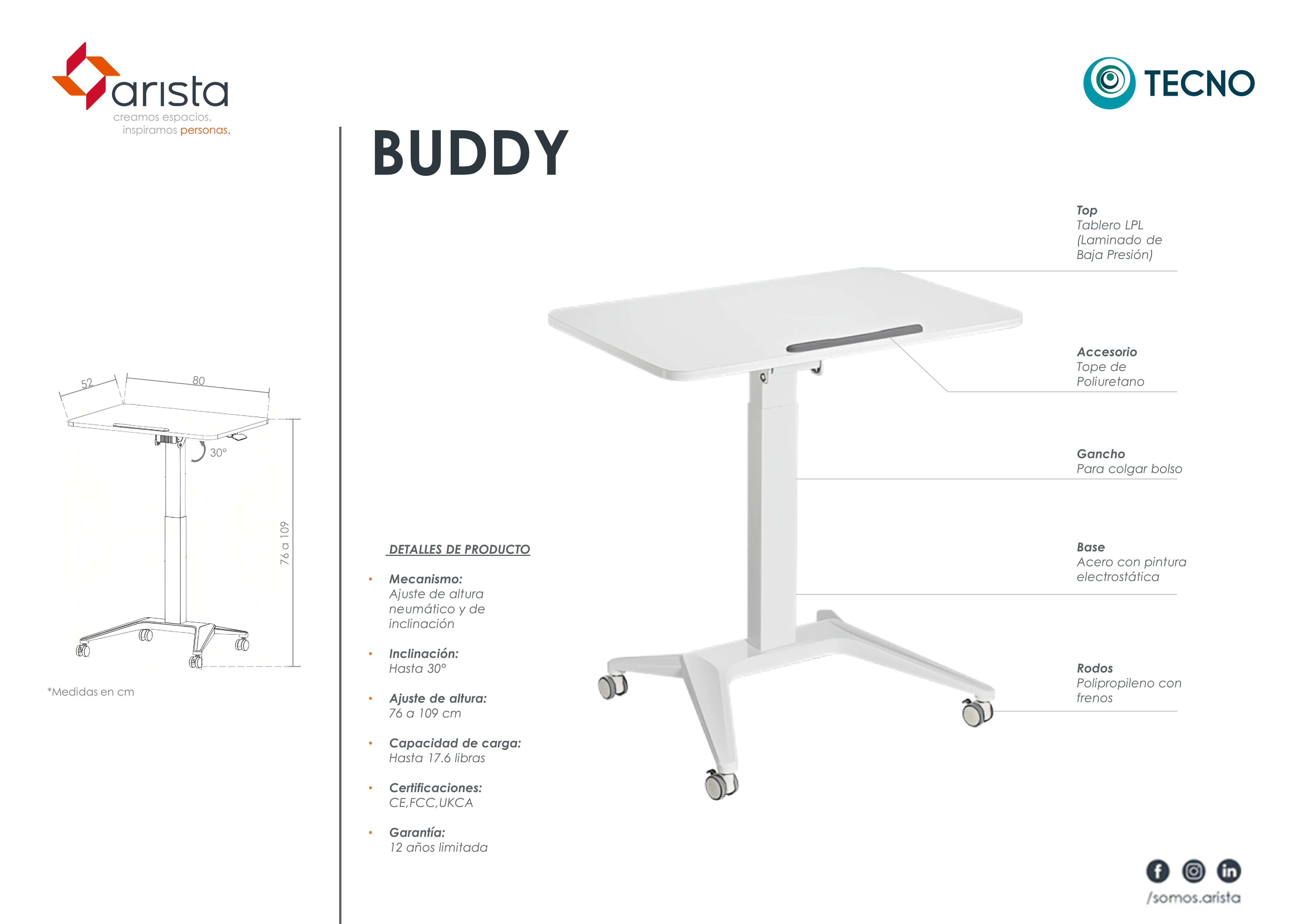 Cuenta con: rodos para fácil transporte, ajuste de altura y ajuste de inclinación del tablero.